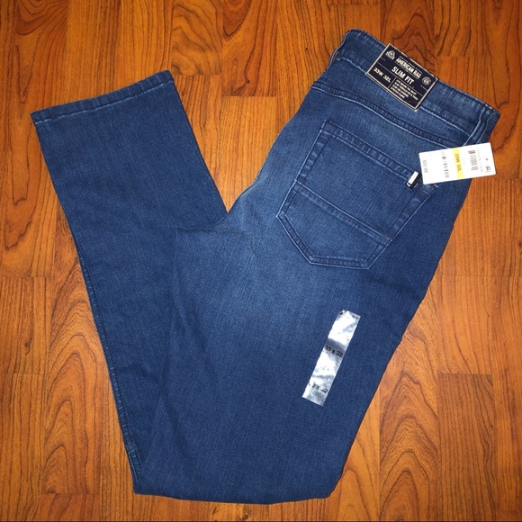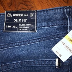 NWT. American Rag slim fit, lightly distressed jeans with stitching detail on the front. Size 33 waist, 32 long.
