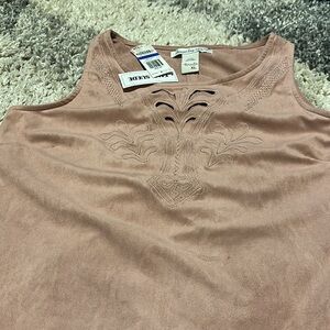 American Rag faux suede tank top. Key west style T0312N5AR in dusty rose color. Instructions state to wash separately before wearing. This has a small pen tip stain which may come out in the wash, as shown. I love to bundle!