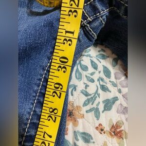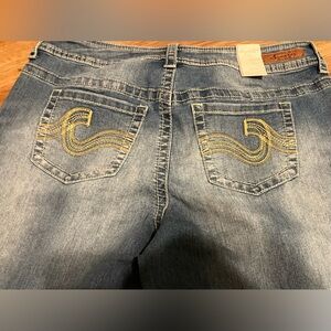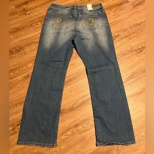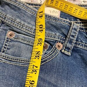 Mid rise jeans with a slim through knee fit. Boot leg style. Classic blue denim.