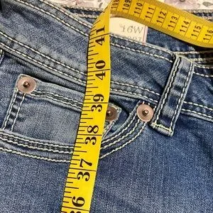 Mid rise jeans with a slim through knee fit. Boot leg style. Classic blue denim.