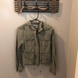 Green American Rag military jacket in great condition. Thick green denim material, zipper, button, and drawstrings on it. Hood is detachable.