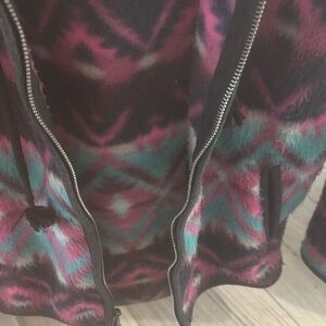 Cozy fleece jacket with a bold geometric design. Features a blend of pink, teal, and black. Perfect for stylish warmth.
