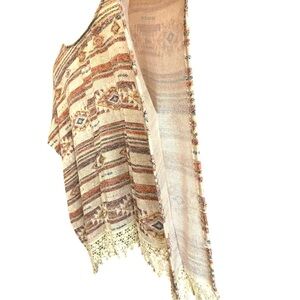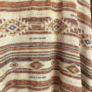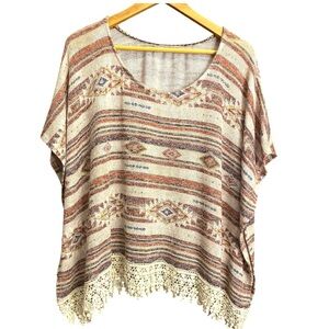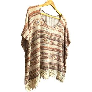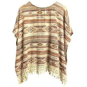 Stylish poncho with a multicolor striped pattern. Features a crochet hem for added elegance. Perfect for layering.
