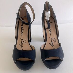 Chic navy blue heels with ankle strap. Peep-toe design. Perfect for any occasion.