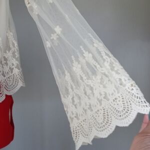 Floral lace, elastic around collar Full linen and lace-up Long bell sleeves. ML