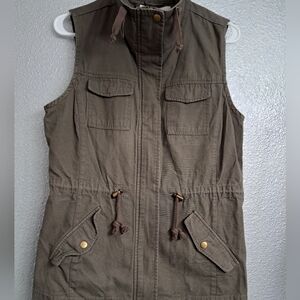 in very good condition, mock neck with drawstring, two hidden snap chest pockets, gathered waistline with drawstring, two front snap pockets, snap closure, 100% cotton, pit to pit 20" length 28"