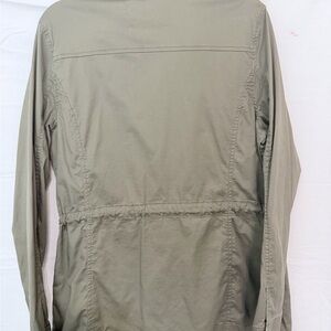 Chic olive utility jacket with front pockets. Adjustable waist for a tailored fit. Ideal for layering.