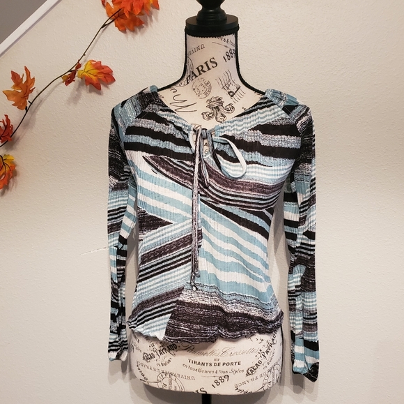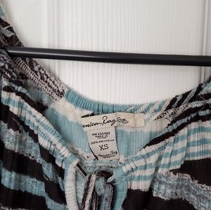 In good condition, very light and breathable with adjustable strings for neckline. It has a beautiful mint, black, and white pattern all throughout.