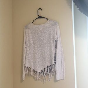 This sweater is great to keep warm, and is also light enough to wear into spring. The tassels on the bottom are a great addition, and the angled hem makes it flattering and great to pair with jeans.