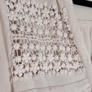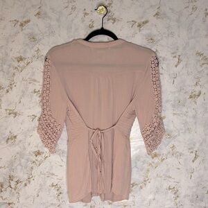 Chic pink blouse with crochet sleeves. Button-down front. Perfect for casual wear.