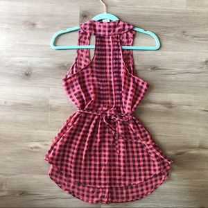 Sheer, see through, and flowy Razorback tank top. Ties from the back. Second picture is backside. 100% polyester