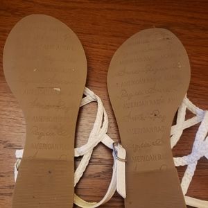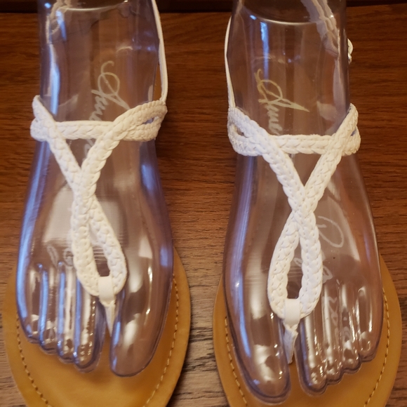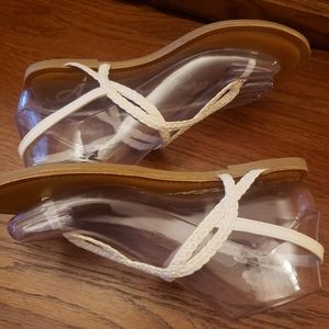 These sandals are man made. They are white with a braided twist design. They are gently used.