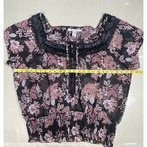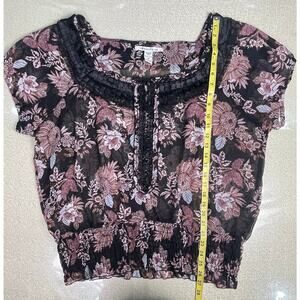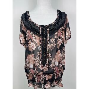 Flowy and feminine, this American Rag chiffon blouse features a romantic floral print on a sheer black background.