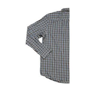 This American Rag Cie Men's Long Sleeve Shirt is a casual button-up featuring a stylish plaid pattern on a blue, black, and white backdrop. Crafted from a comfortable blend of cotton and polyester, this 2XL size shirt elevates any wardrobe.