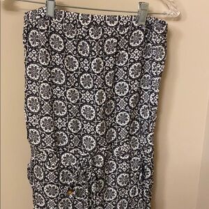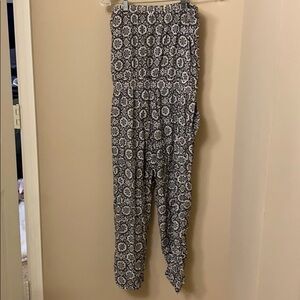 22 inch inseam, and from the waist to the crotch is 9.5 inches, and from the neck down to the waist is 14 inches. In good condition. The bottom of the leg is elastic and wrap ruffled up a little. Drawstring waist and two side pockets.