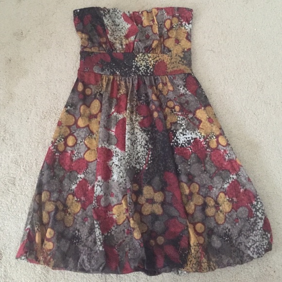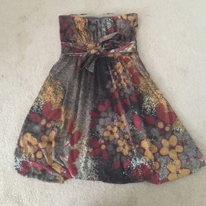 This is a great dress. It's strapless. It's great for fall because of the fall colors. It's got a tie in the back. The tag was ripped off, but I have the same dress in my closet in a different pattern! Check that out too!!!