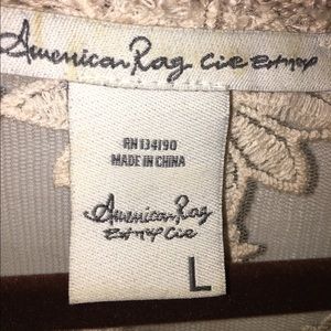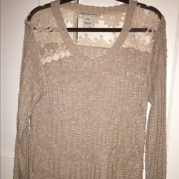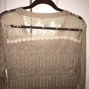 Pretty American Rag Sweater with gorgeous Lace detail on top. Both front and back. Tan sweater with cream Lace. Looks like new. Only worn a couple times. Size L