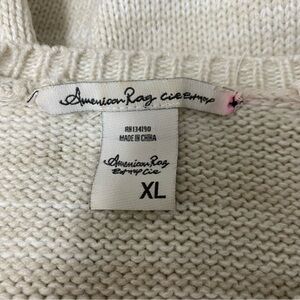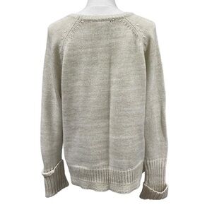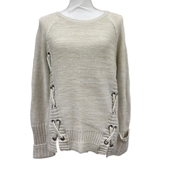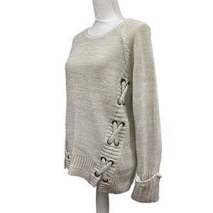 Oatmeal colored sweater, boat neck, long sleeves. Eyelet and stitch detail at front.