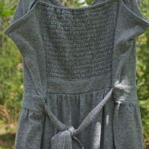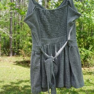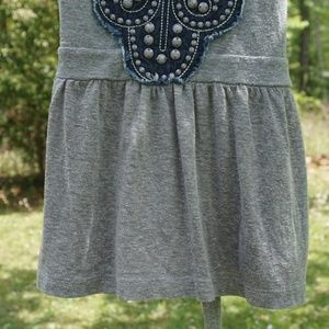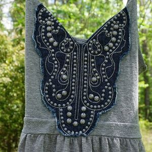Features: Beautiful jean and Grey Rhinestone front design, loose fit bottom, ties in the back below an elastic ribbed back.