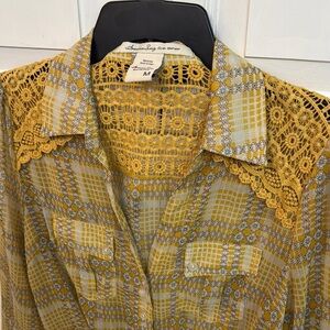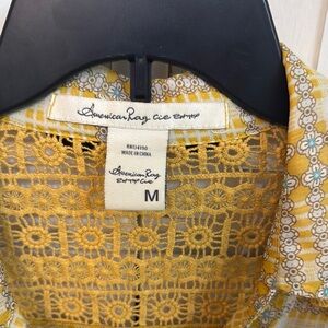 This button up from American Rag features a yellow hue, adorned with intricate lace and a stylish tie front. Size M. Coastal cowgirl. Bohemian.