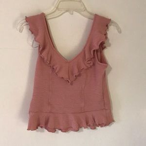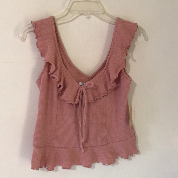 Beautiful pink American Rag sleeveless shirt! This top has a slightly cropped hemline and has a flounce style neckline.