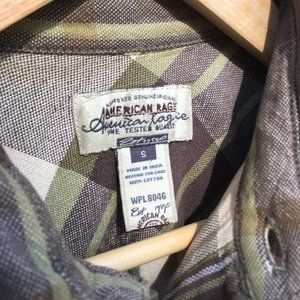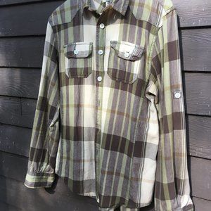 This plaid button up shirt is soft to the touch but rugged in appearance. It's 100% cotton material has the feel of a soft twill. It has a western and expedition outdoors feel and style, without the snap buttons. The sleeve button back is a nice touch. I'm a bit sad to see this one go, but all in the name of minimalism and getting van life ready! You'll love it just as much as I have. **This runs a tad large, I usually wear a medium (5'8'', 160lbs) and it fits me well. Similar to Carhartt.