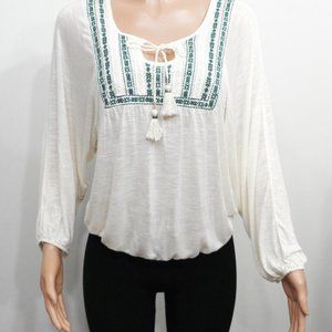 Chic white blouse with intricate green embroidery. Features a tie-front detail. Perfect for casual wear.