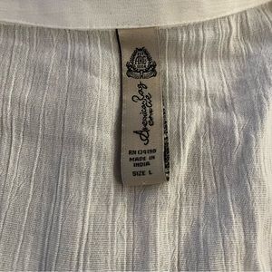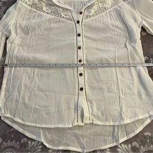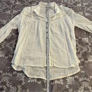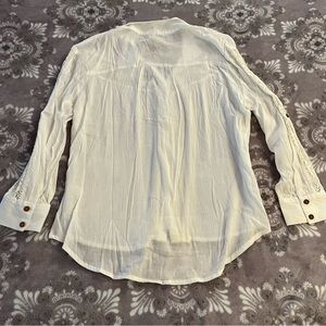 American Rag white sheer collared button up. Size: Large. 55% Cotton, 45% Viscose. Approximately: 21.5 inches wide, 27 inches tall in front, 30 inches tall in back. No rips, tears, pulls or stains. Will iron before shipping. Smoke-free household