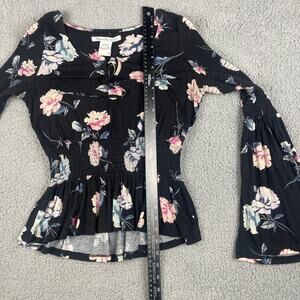 The item you are looking at is a pre-owned American Rag Women's Small Black Flower Rayon Spandex Long Sleeve Blouse