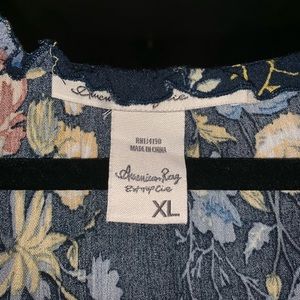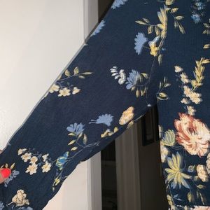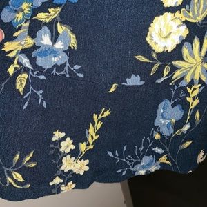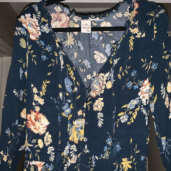 Pretty blue and yellow boho style dress. Button front, tie neck, gathered elastic waist, 3/4 sleeve. Size XL, fits like a large.