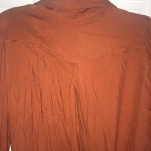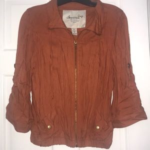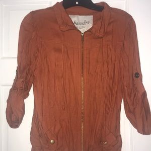 Gently worn. Rusty orange jacket, lightweight, three quarter sleeves with the option to be buttoned up, two real pockets. 22.5 inches long from shoulder to hem