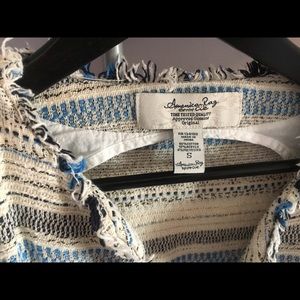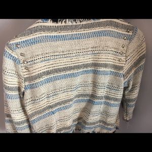 American Rag blazer with frayed ends, colors of black and blue woven throughout with an ecru base. Very cute with jeans. Non smoking home.