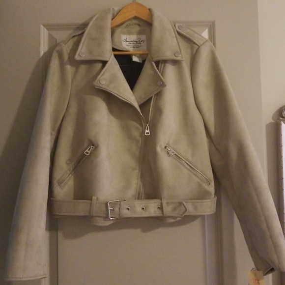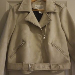 Suede like material, soft, American Rag Jacket . Color is a tan. NWT size Large but can fit a Medium.