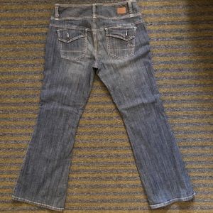 Lightweight jeans with stretch. Inseam approx 30 inches. Rise approx 8 inches. Flare leg.