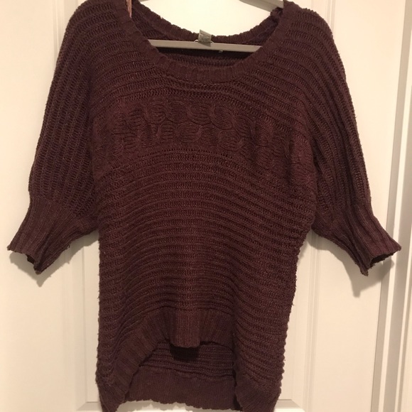 Plum colored American Rag sweater. Hem of sweater is shorter in the front and longer in the back. Sleeves are 3/4 length. Size L and in great condition - minimal pilling.
