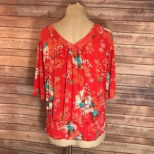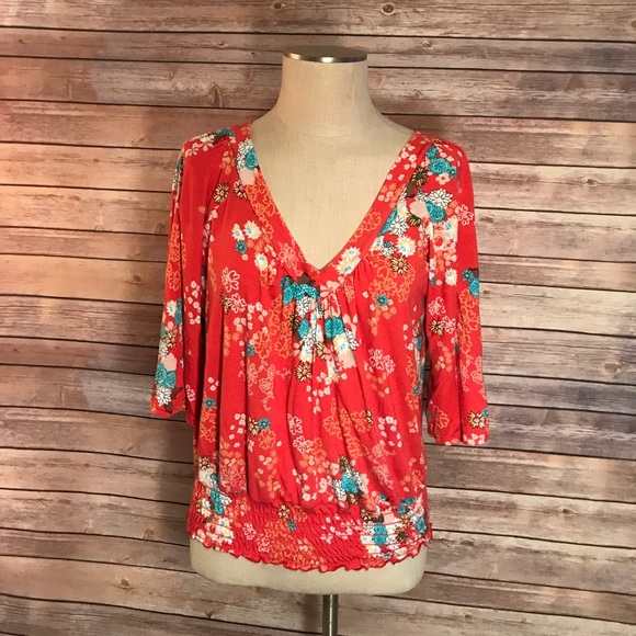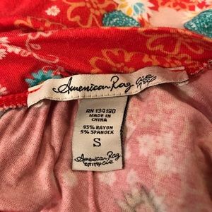 American Rag top. Size small. Color red with blue and white design on it. V-neck front and back. Rayon 95% spandex 5%.
