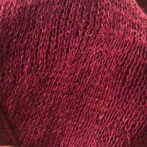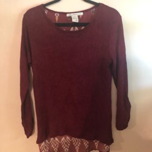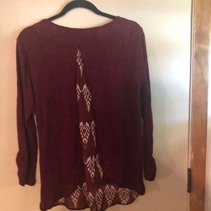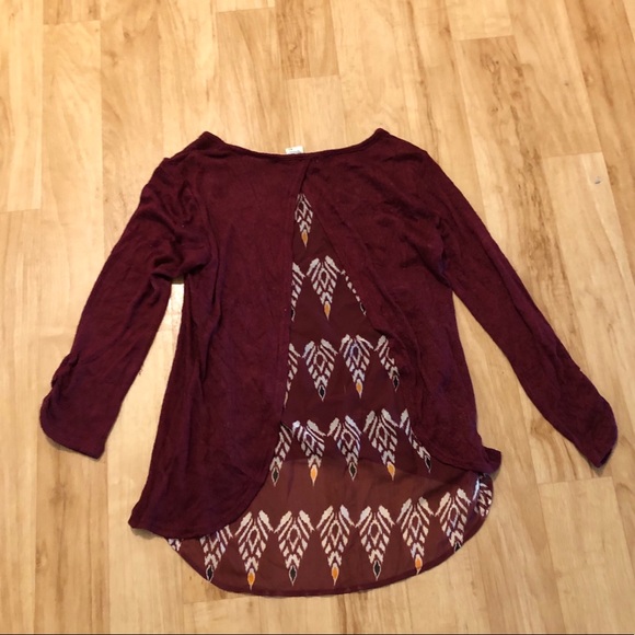 Gently worn American Rag top. The top is like a very thin sweater material. It is 3/4 sleeve with ruching and a split back with sheer tribal print fabric.