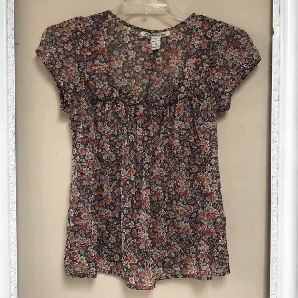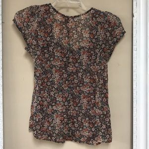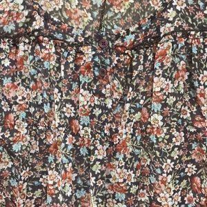 American Rag top with button closure, cap sleeves. Size: M. Color: dusty purple, white, rust, light blue, pink. Measures: 18” from armpit to armpit 24” from shoulder to hem. 100% polyester. Very light weight. (1727)