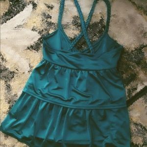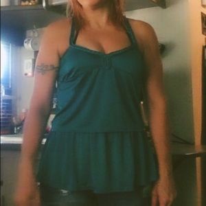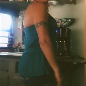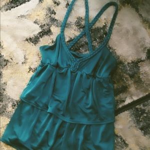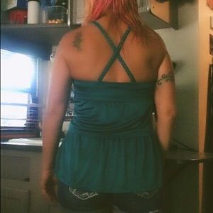 American Rag size XS.. Dark teal green. Silky. Ruffled look. Button in back. Good condition.
