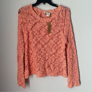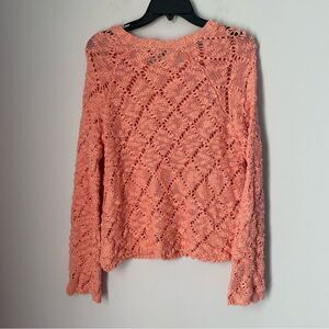 Boat neck, crochet like knit. Long sleeve. Coral color