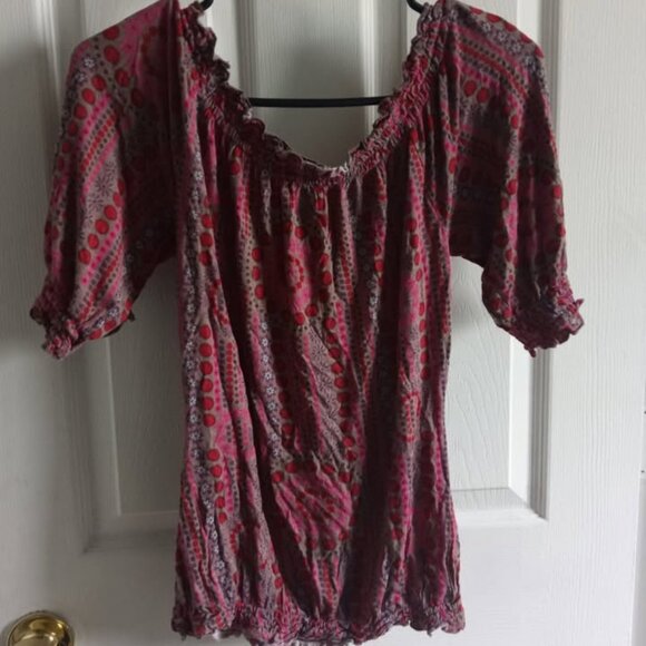 Size small off-the-shoulder or on-the-shoulder ruched top. Super cute boho chic,