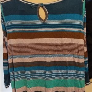 blue brown and beige striped pullover top 3/4" sleeves