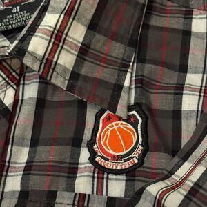 Classic plaid button-down shirt featuring a unique basketball patch emblem. Made with a comfortable cotton blend in a stylish gray, black and red plaid pattern. Front button closure with two chest pockets. Perfect for casual outings, school days, or any sporty-casual occasion. The shirt has a cool athletic vibe while maintaining a put-together look. Long sleeves with button cuffs. The basketball patch adds a distinctive sporty touch to this versatile piece.