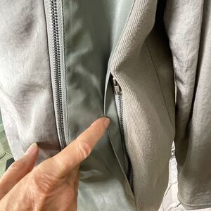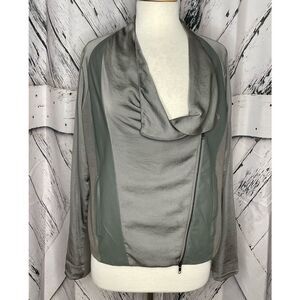 Silk-like polyester jacket with genuine leather trim. Asymmetrical zipper front with a draped collar and zip pockets.