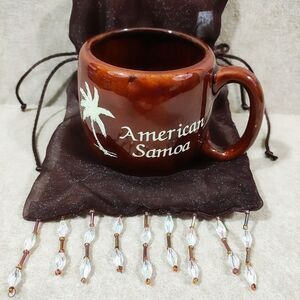 This American Samoa Ceramic Coffee Cup Mug was made in Honolulu, Hawaii and is the perfect addition to your collection of dinnerware and serveware. The circumstance measures approx 11 inches and it is approx 4 inches tall. Crafted from high-quality ceramic and porcelain, this mug is sturdy, durable and has never been used. It features a beautiful brown color and can be used to enjoy both hot and cold beverages. The mug is perfect for collectors and those who appreciate the unique beauty of American Samoa. It comes with a coffee mug and is ideal for use in the kitchen and home. This collectible mug is a must-have for anyone who loves to collect unique and beautiful mugs.