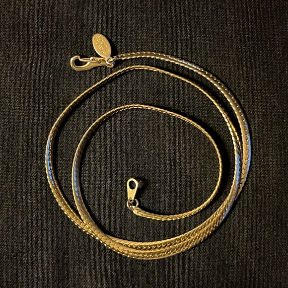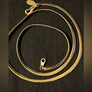 Gold tone herringbone chain. 18” long. Marked Korea at clasp. Hang tag marked American Showcase. This chain is very shiny and in good condition. Unisex