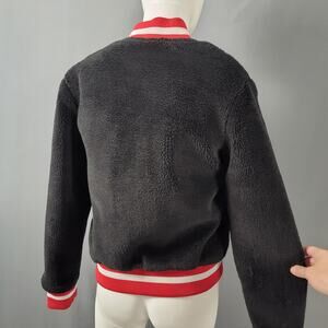 American Stitch black sherpa bomber jacket featuring plush textured fleece and bright red varsity-style rib trim at the collar, cuffs, and hem. The orange quilted lining offers warmth without bulk, creating an ideal transitional layer for cool weather. Classic zip-front closure and welt hand pockets maintain the sleek streetwear look while adding everyday function. This piece blends athletic and urban influences—perfect for pairing with denim, cargos, or joggers for an effortlessly casual fit. The relaxed bomber cut flatters multiple body types, delivering comfort and structure in one. Excellent pre-owned condition with no visible flaws.