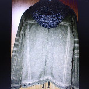 Women's American Stitch hooded army green jacket, size XL. Full zip, snaps at the sleeves. Four pockets on front & a pocket on the inside. Weathered look with a knit lined hood. Jacket is thick for warmth. Approximate measurements: