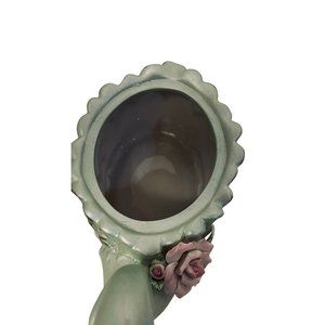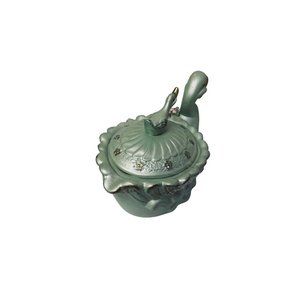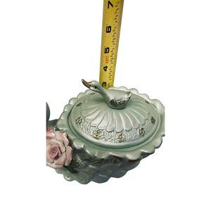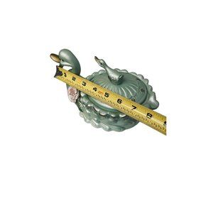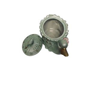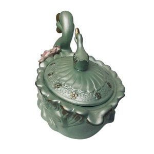 This American Style Porcelain Blue Swan Lidded Cookie Jar is a decorative collectible that adds a touch of Mid-Century Modern style to any space. Its solid pattern and green color make it a unique piece for your home.
