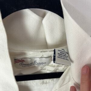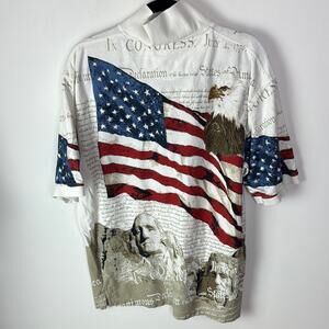 Gently Used American Summer Short Sleeve Polo. This is a men's XL. True to size fit IMO. White with red, white, and tan patriotic images throughout. Waving flag, Mt. Rushmore, the Constitution, bald eagle, etc. 100% cotton.